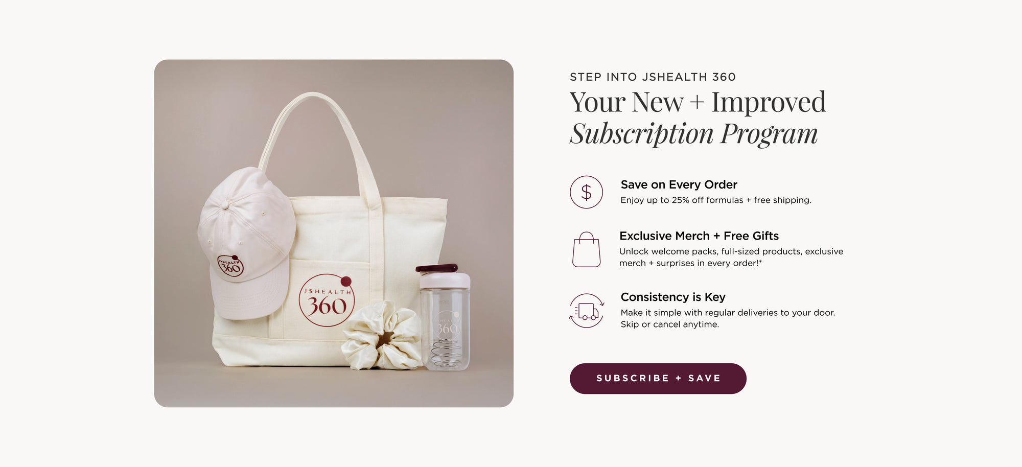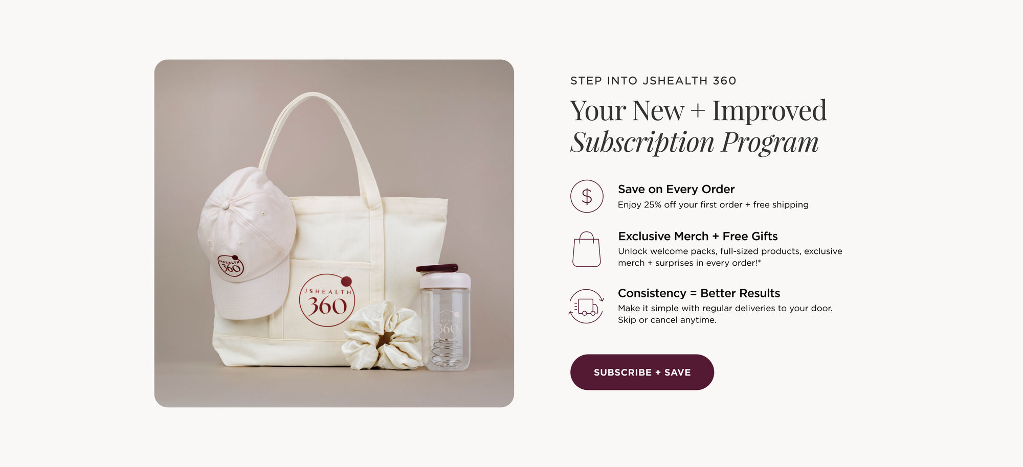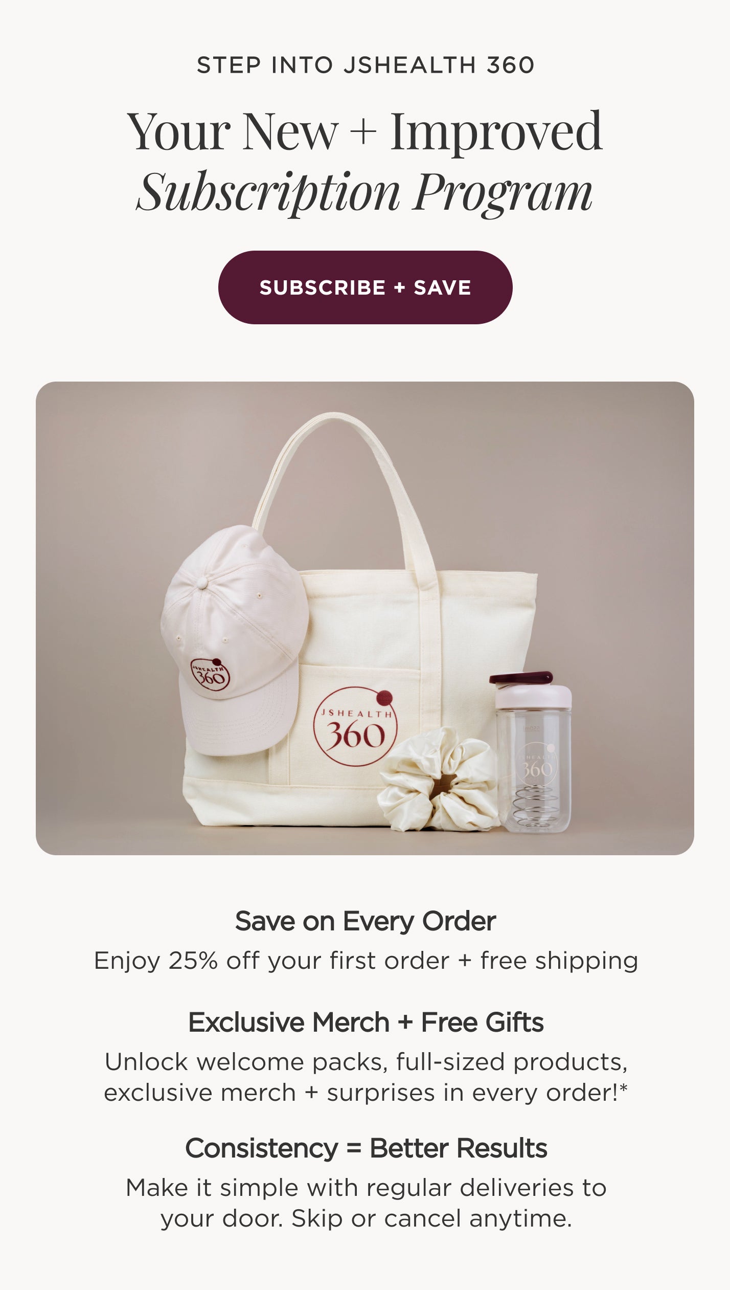 Start your JSHealth Vitamins Subscription by selecting 'Subscribe + Save' on any product page. Already have an account? Login here.