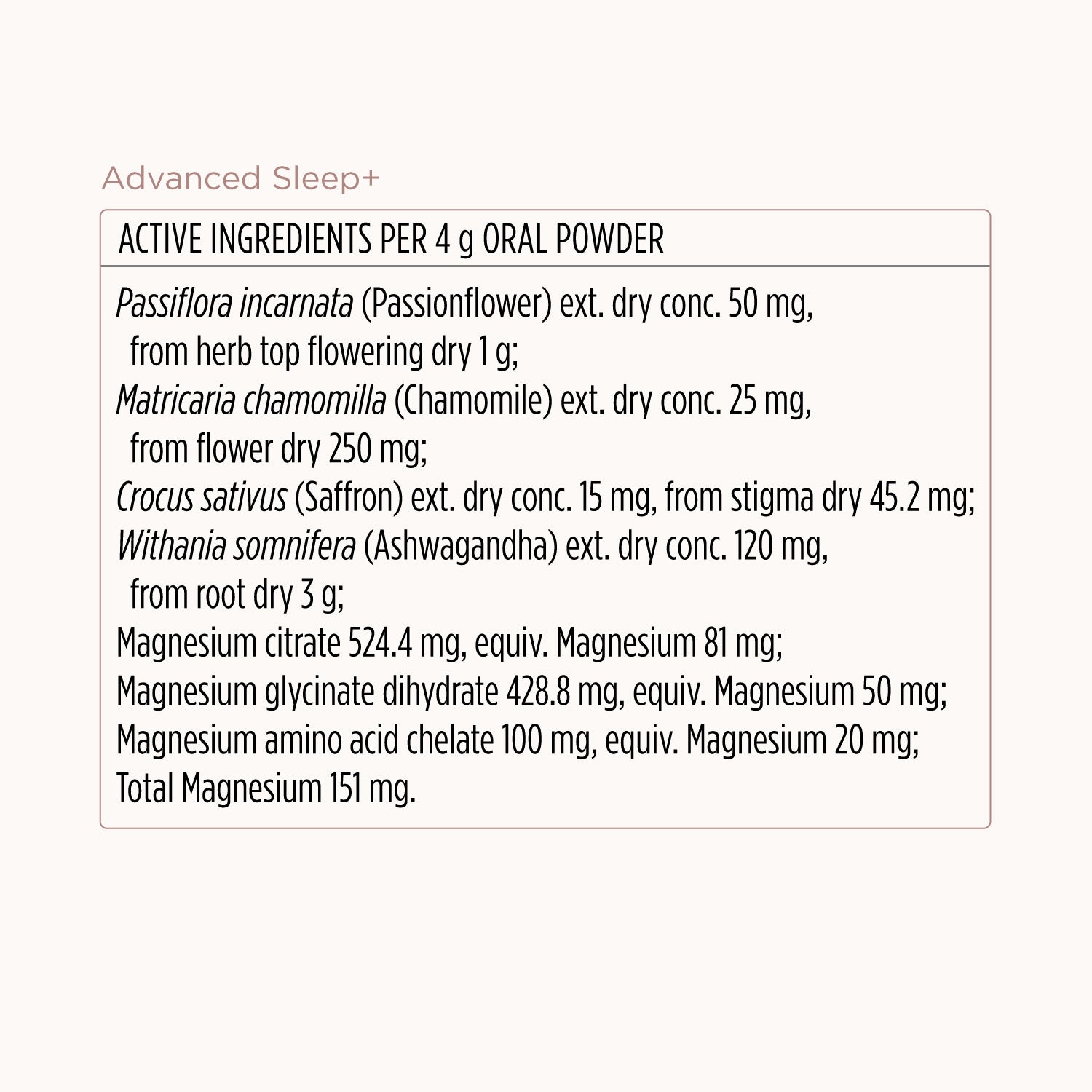 - Precision-dosed Passionflower, Ashwagandha + Magnesium for undisturbed nights and refreshed mornings