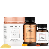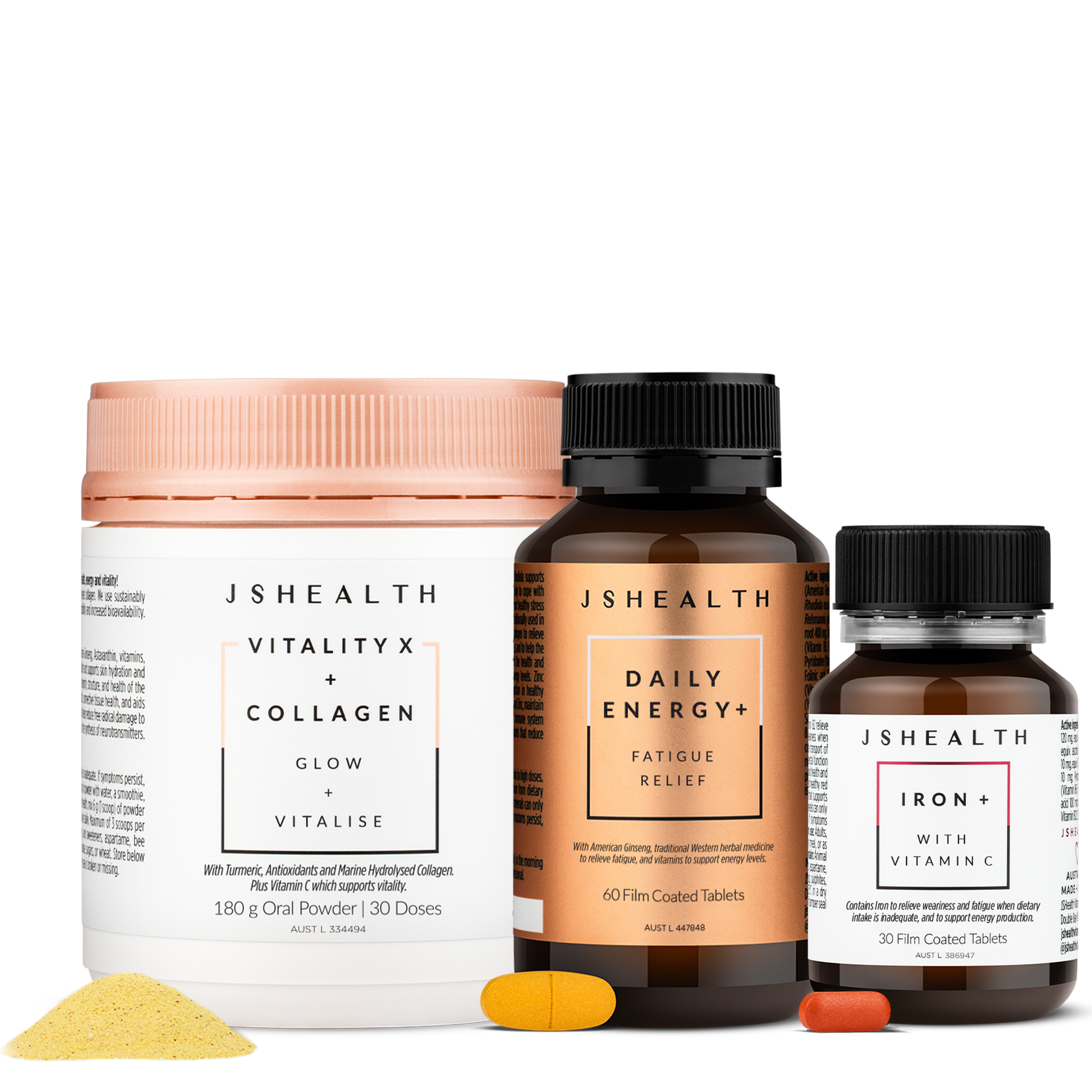 Good morning sunshine! This trio contains our favourite products Daily Energy+, Vitality X + Collagen and Iron+ to support your morning routine.