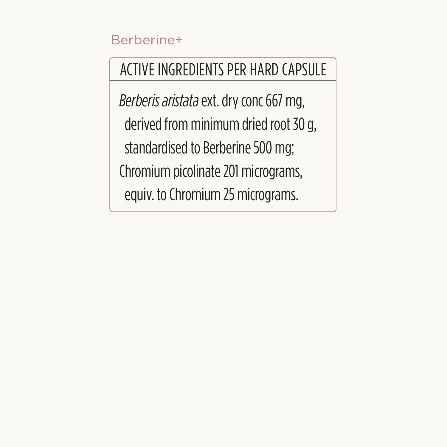 Berberis aristata ext. dry conc 667mg, derived from minimum dried root 30g, standardised to Berberine 500mg;