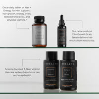 Our #1 hair growth supplement, enhanced specifically for male wellness, alongside 2-Step Vitamin Haircare, plus Vita-Growth Scalp Serum. A system formulated with science-led ingredients for root-to-tip support!