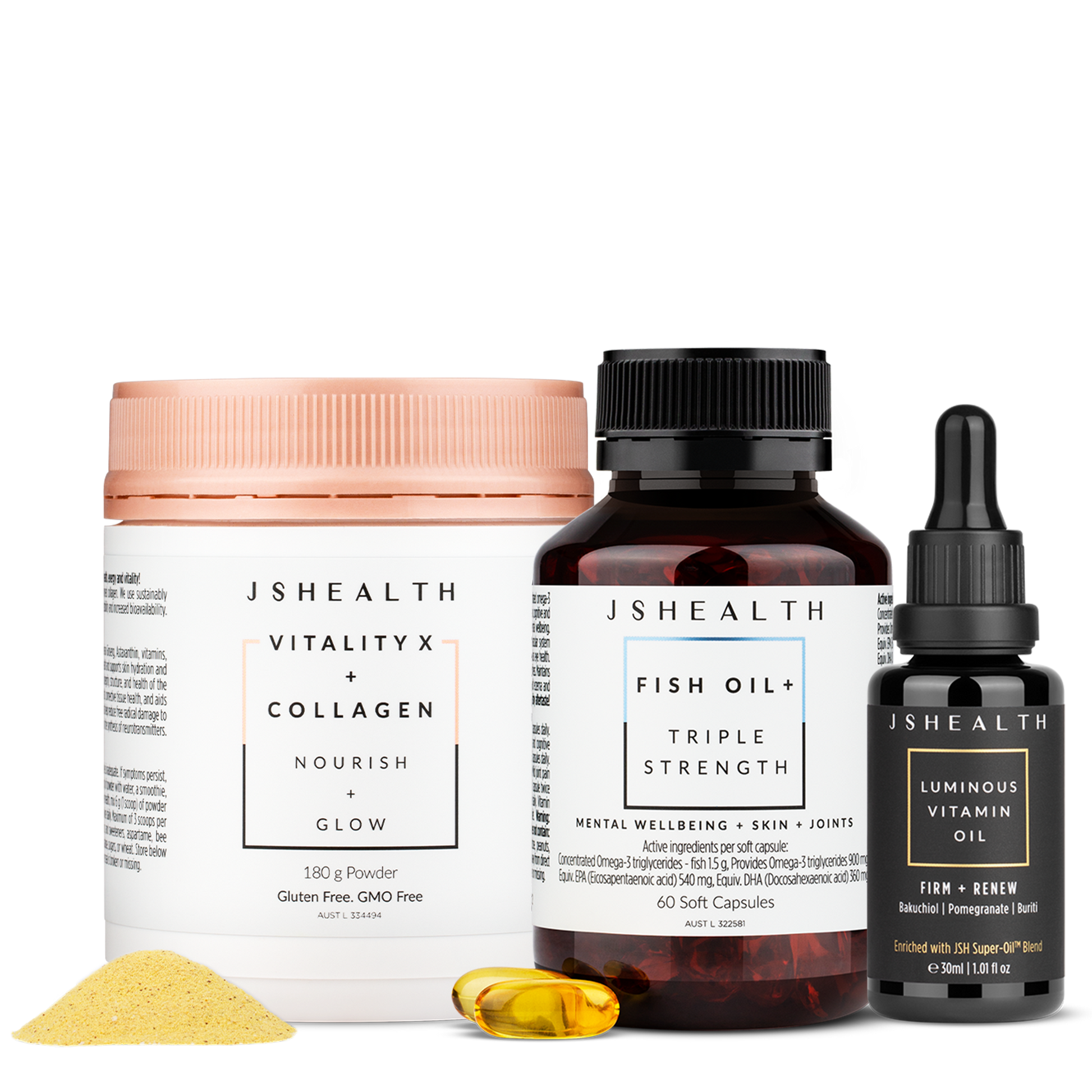Stop the clock and enhance your glow with our Skin Reset Trusted Trio. This bundle contains our Pro-Collagen Vitamin Serum and Luminous Vitamin Oil, VItality X + Collagen and our Fish Oil (60s) formula.