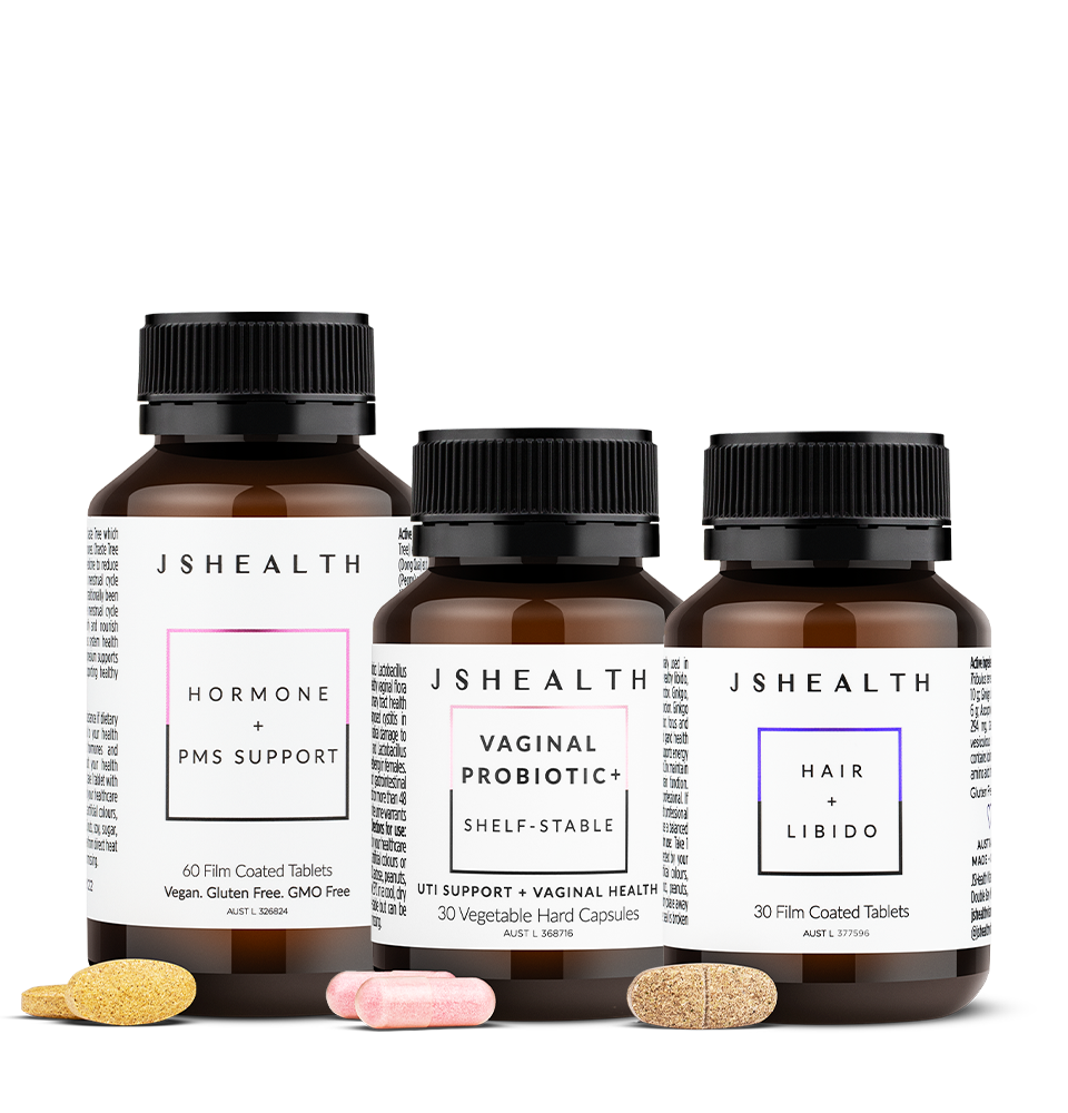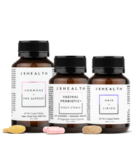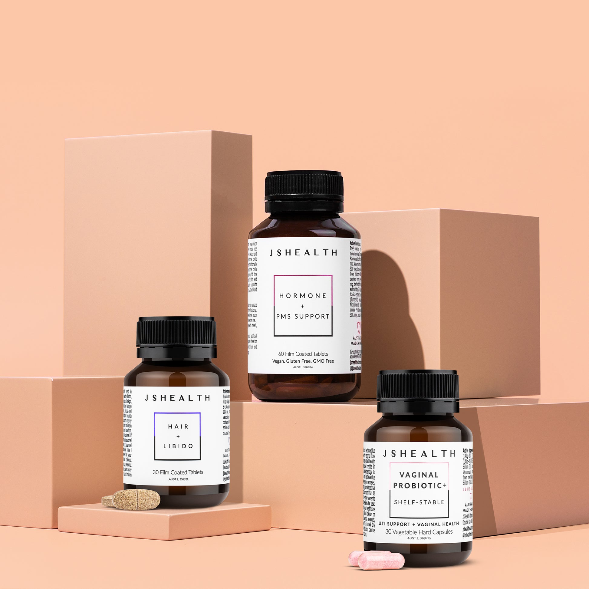 Designed to support your female needs, this kit features Hormone + PMS Support, Vaginal Probiotic+ and Hair + Libido.