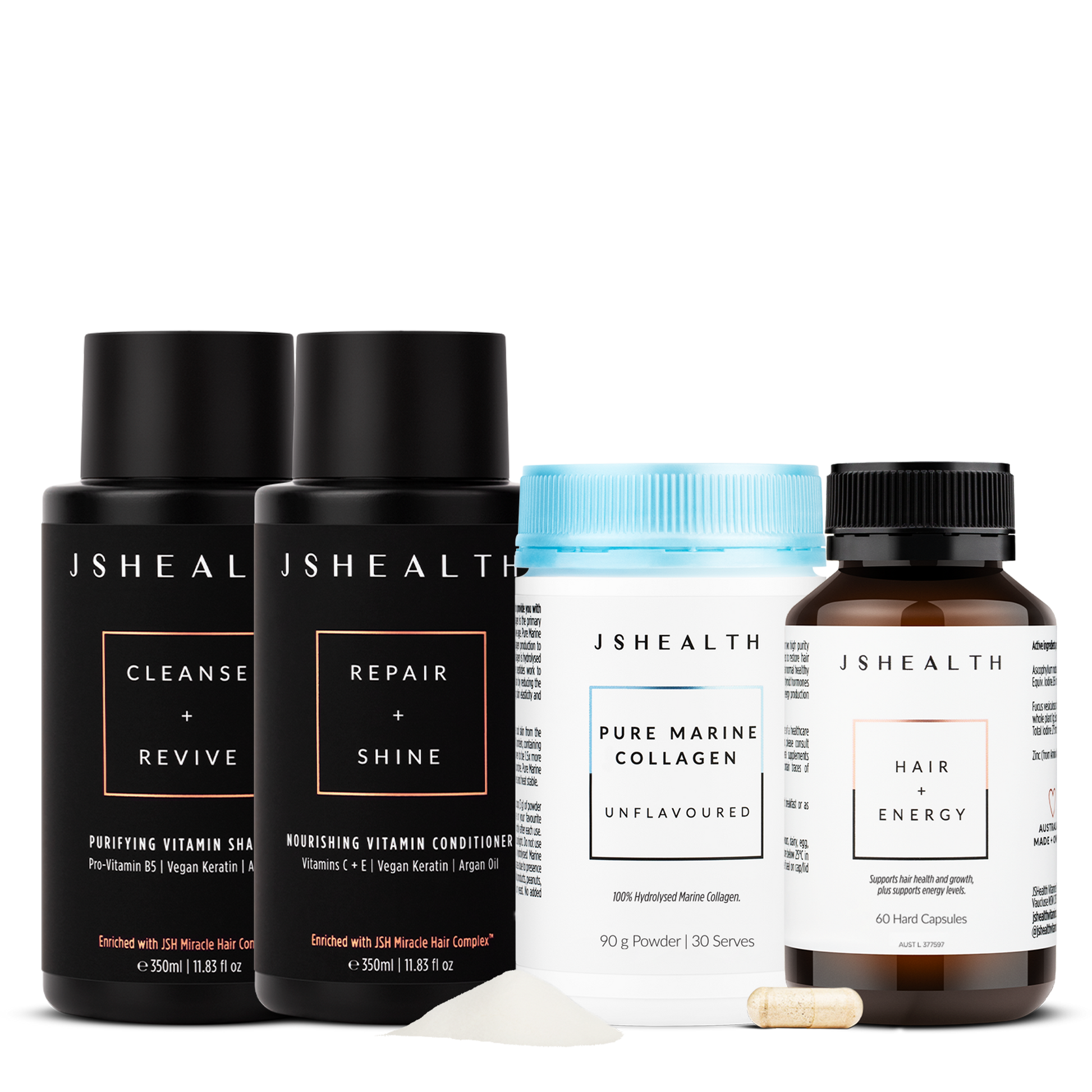 Discover the hair of your dreams with our carefully curated trio. The Hair Goals Trusted Trio contains the Hair + Energy formula, our 2-Step Vitamin Haircare System and Pure Marine Collagen.