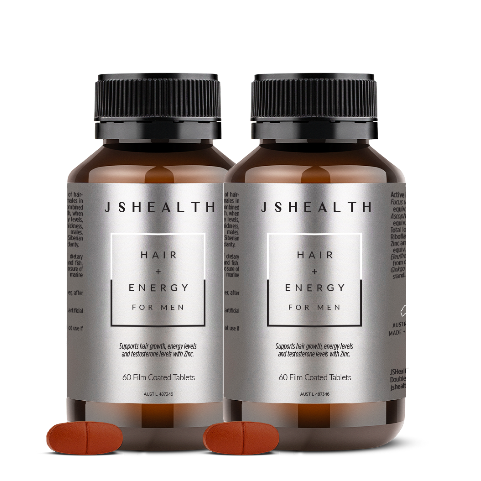 Hair + Energy For Men supports hair growth, health and thickness, plus supports testosterone levels, energy levels, physical endurance, stamina and blood circulation. Formulated with the same proprietary Iodine from our exclusive blend of JSHealth Kelp™ and optimally dosed Zinc, now enhanced with ingredients targeted for male wellness.
