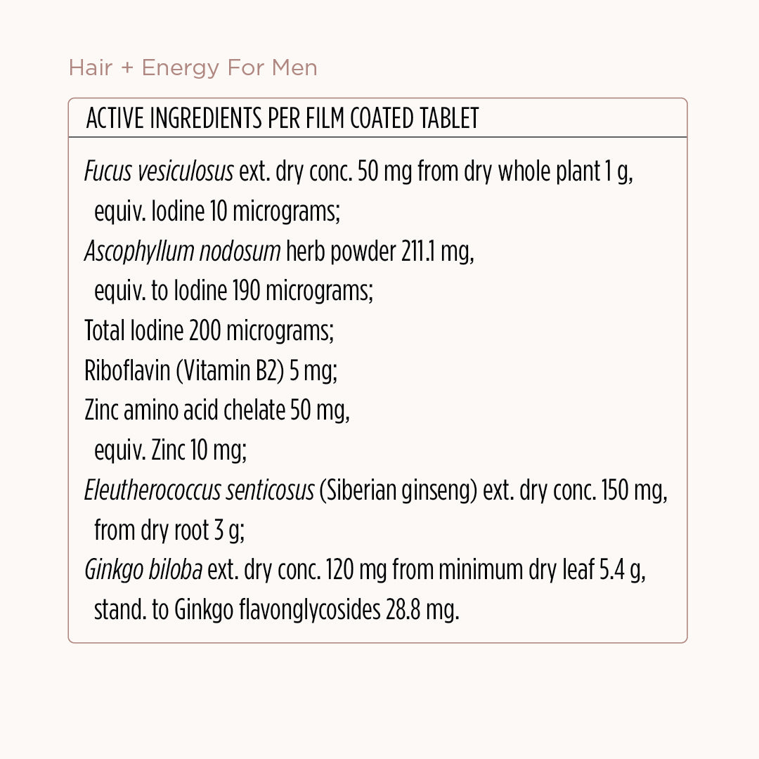 Hair + Energy For Men is our signature blend of hair supporting nutrients, enhanced with herbs selected with males in mind. It contains Iodine from two quality kelp materials, combined with Zinc, Iodine and Riboflavin support hair growth and health, when dietary intake is inadequate. Riboflavin also supports energy levels , when dietary intake is inadequate. Zinc supports hair thickness, testosterone levels and reproductive system health in males. Additionally, Ginkgo supports healthy blood circulation, while Siberian Ginseng supports physical stamina, energy levels and metal clarity.