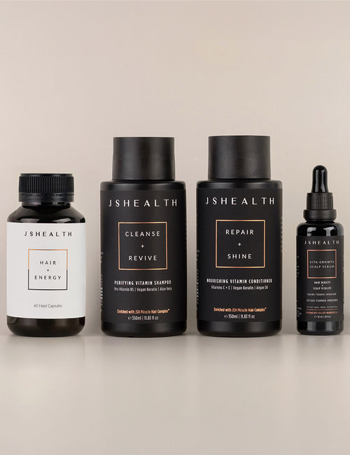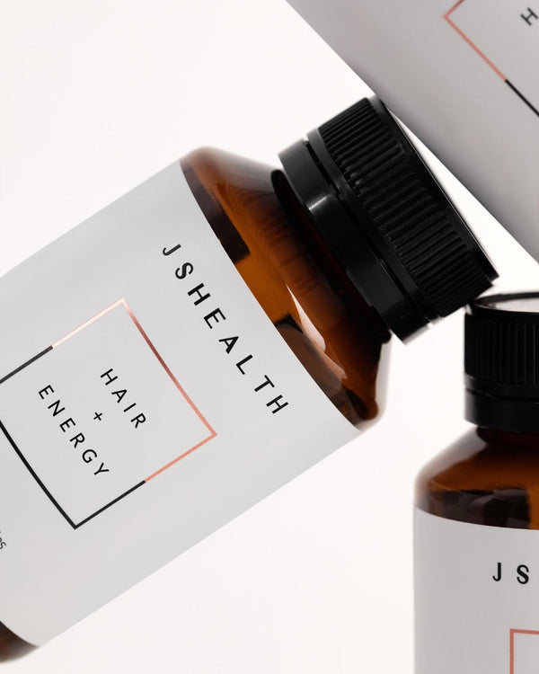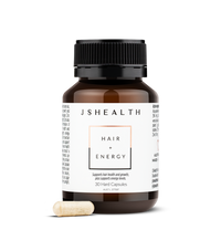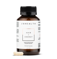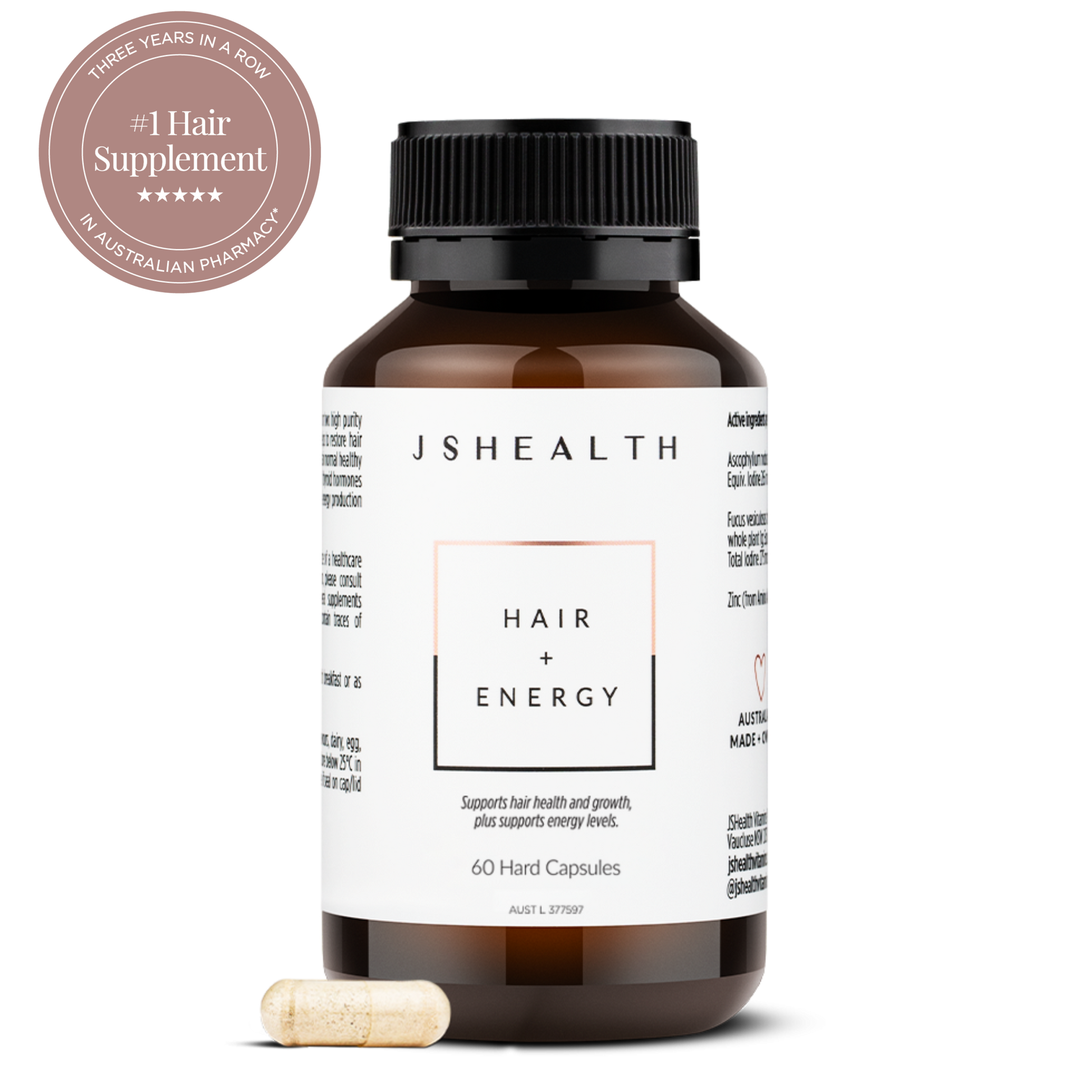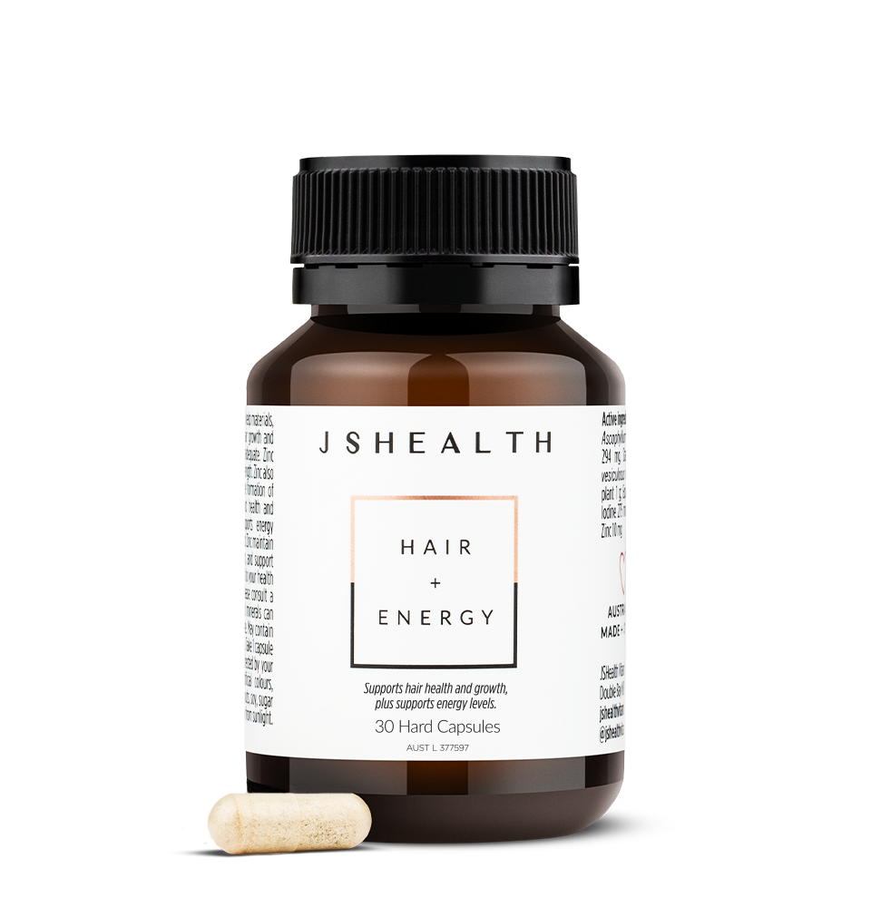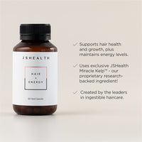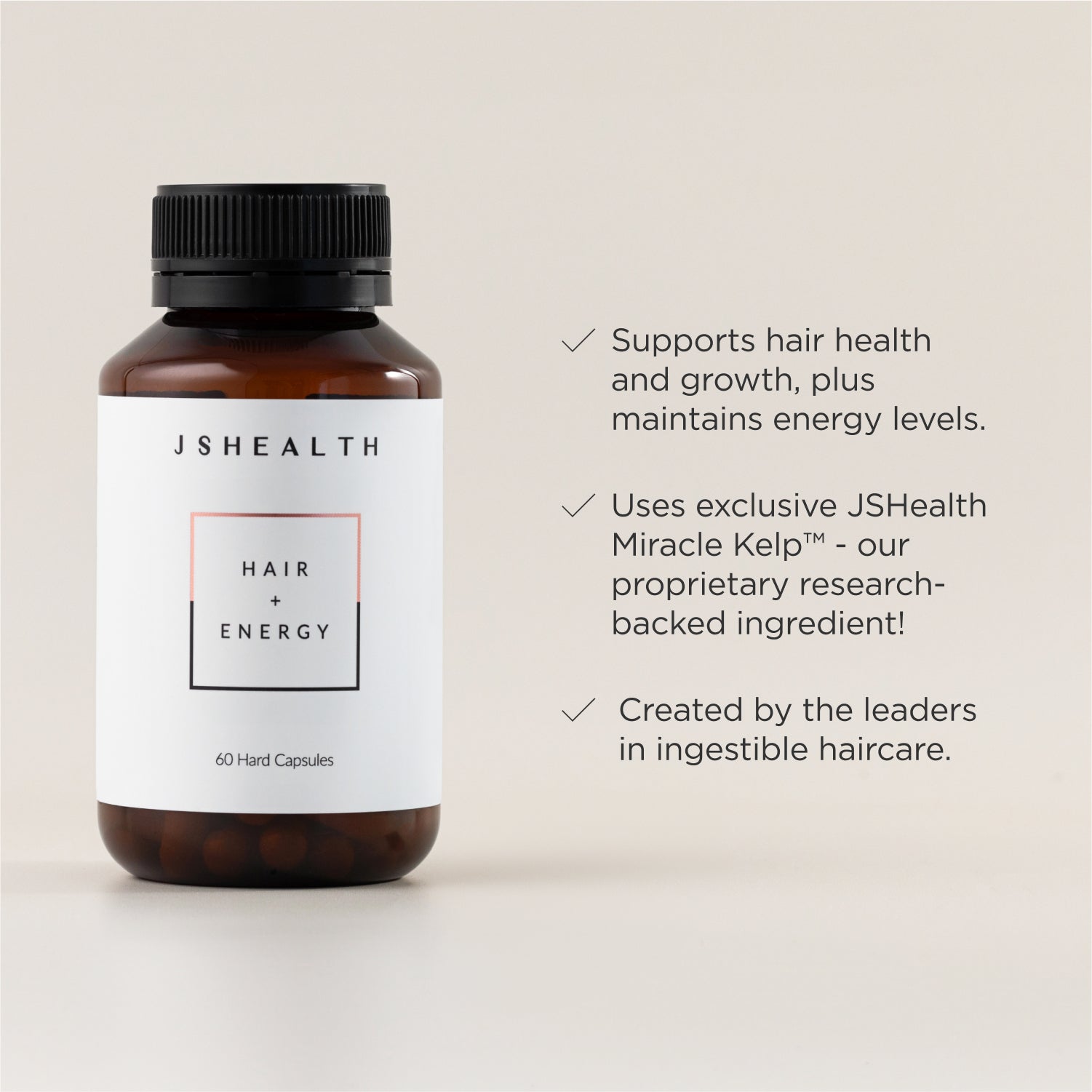 Hair + Energy supports hair health and growth, plus maintains energy levels, with Iodine from our exclusive blend of JSHealth Kelp™. It also maintains hair thickness and strength – all in the convenience of one capsule a day.