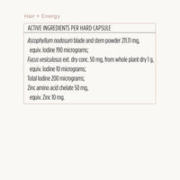 Our Hair + Energy formula contains high-quality Kelp and Zinc. Kelp is high in Iodine, which supports hair health and growth, as well as supporting energy production. Zinc helps to maintain healthy hair and contributes to the maintenance of healthy skin and nails. This formula also maintains and supports hair thickness.