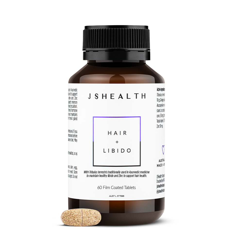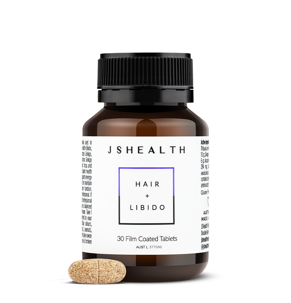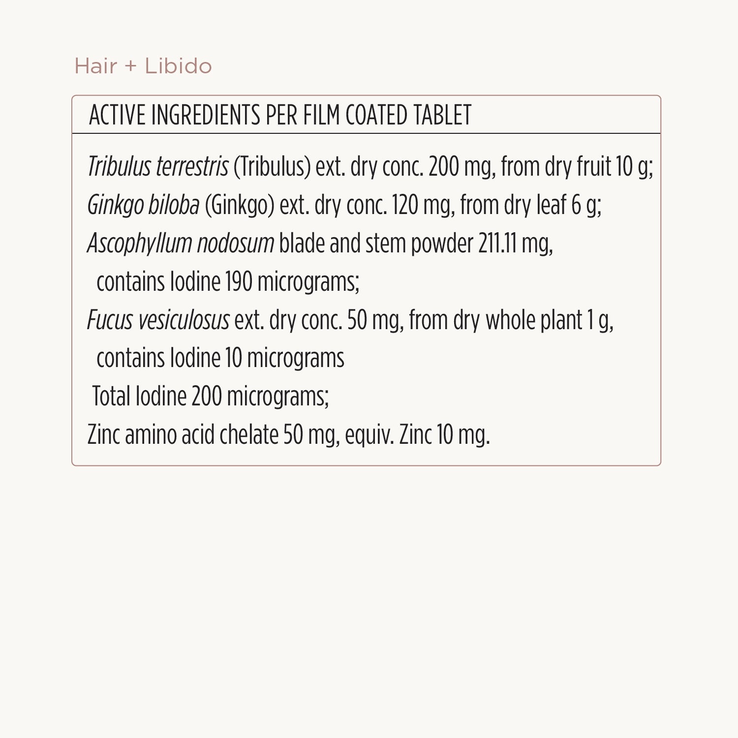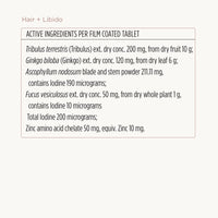 The JSHealth Hair + Libido formula contains herbs Tribulus and Ginkgo, along with two forms of Kelp containing Iodine, plus Zinc.