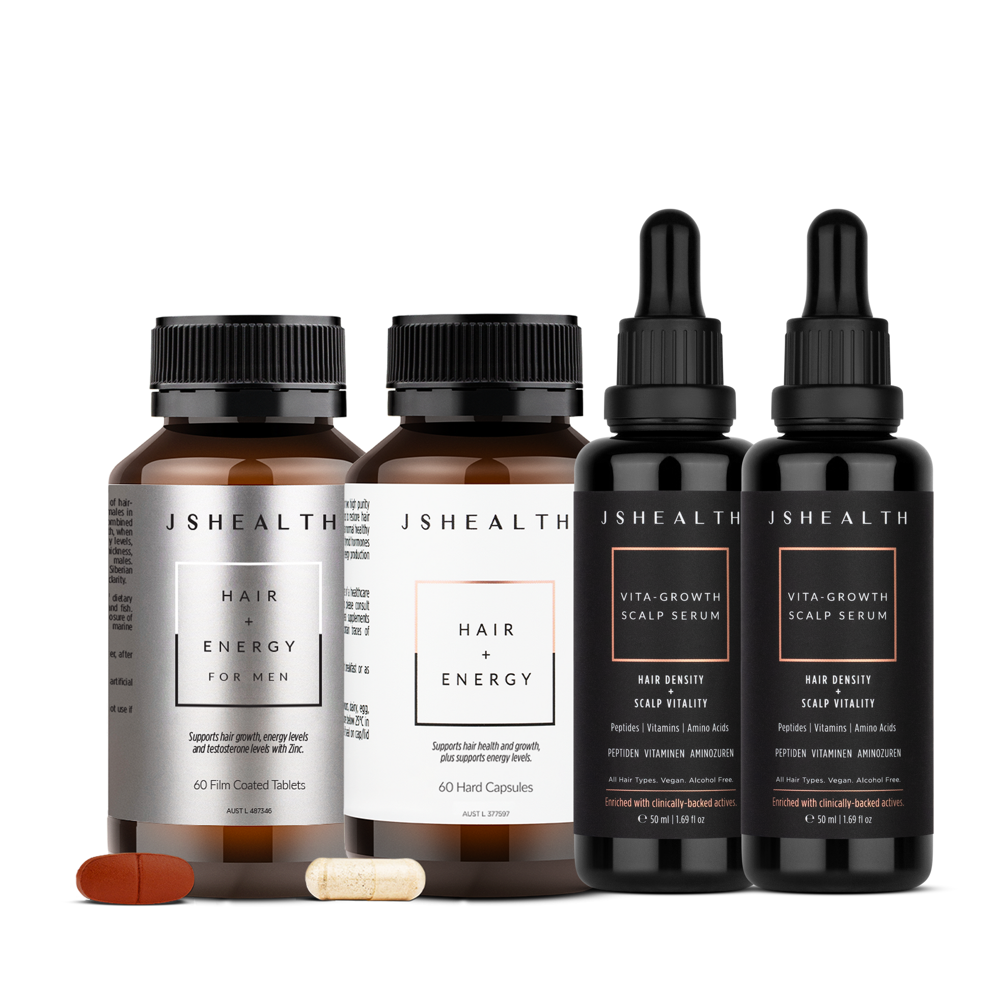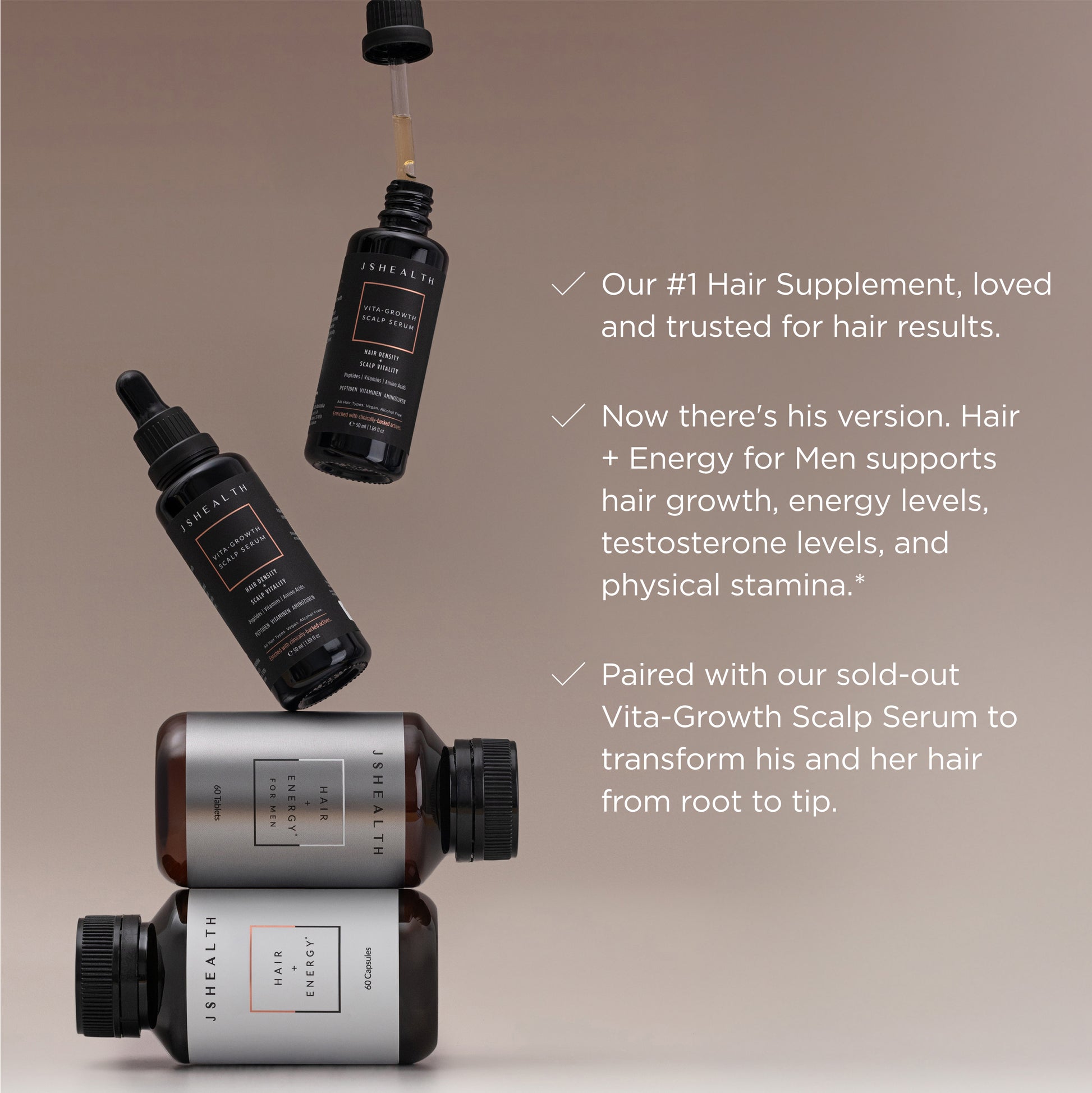 A duo our global best-selling formula, Hair + Energy, in his and her versions, alongside two of our twice sold-out, Vita-Growth Scalp Serums.