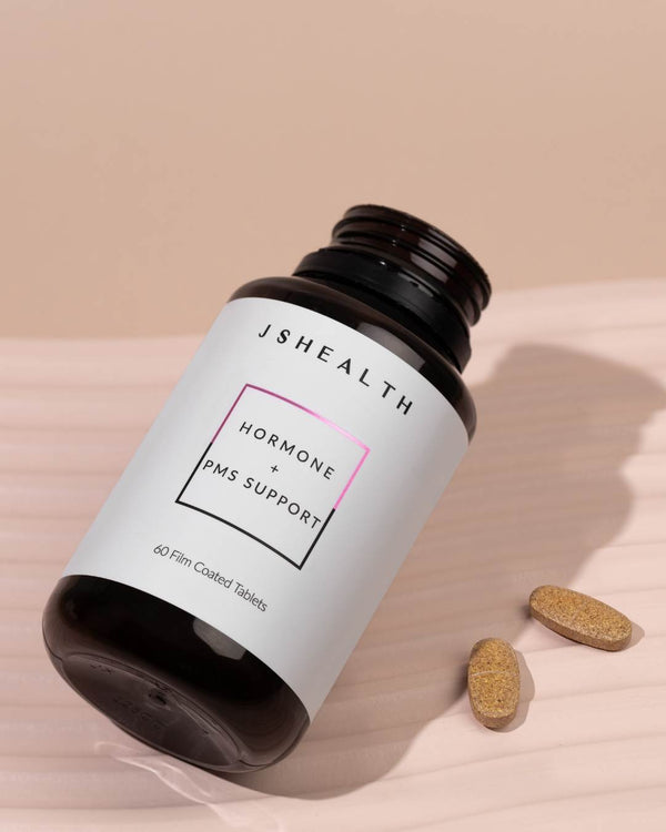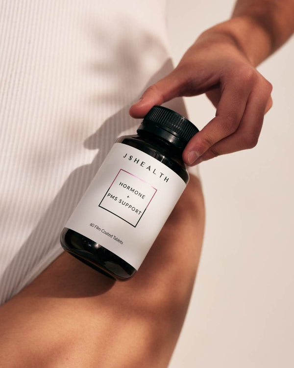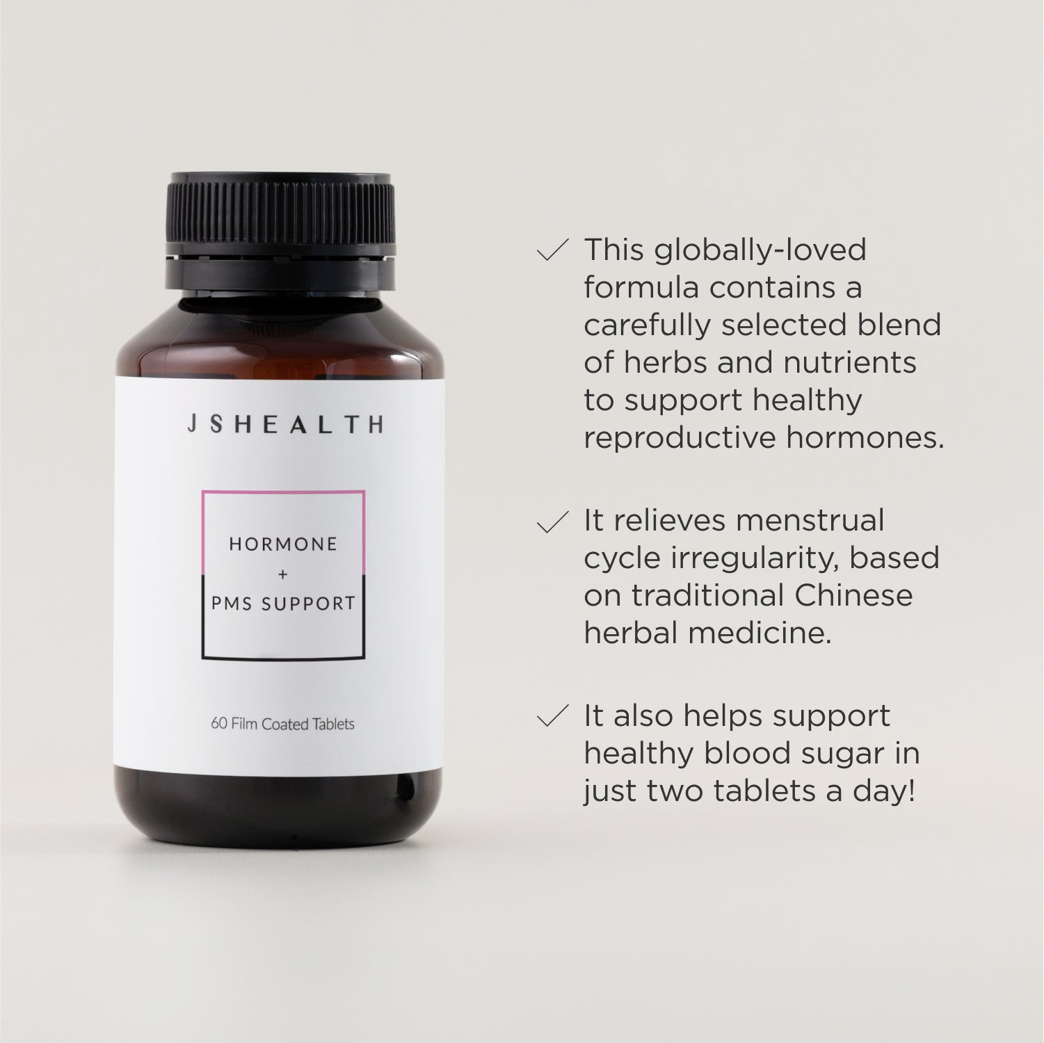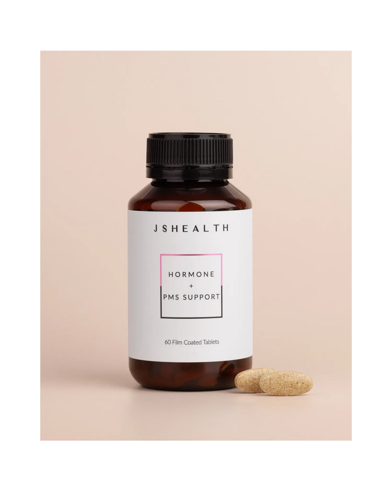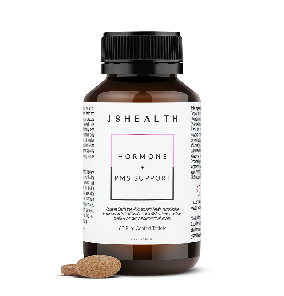 The JSHealth Hormone + PMS Support formula contains Chaste Tree, Dong Quai, B Vitamins and Magnesium.