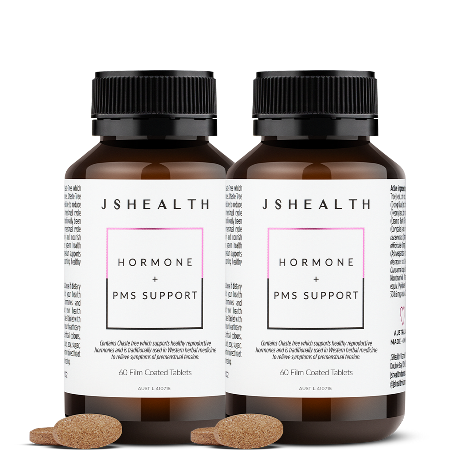 The JSHealth Hormone + PMS Support formula contains Chaste Tree, Dong Quai, B Vitamins and Magnesium.