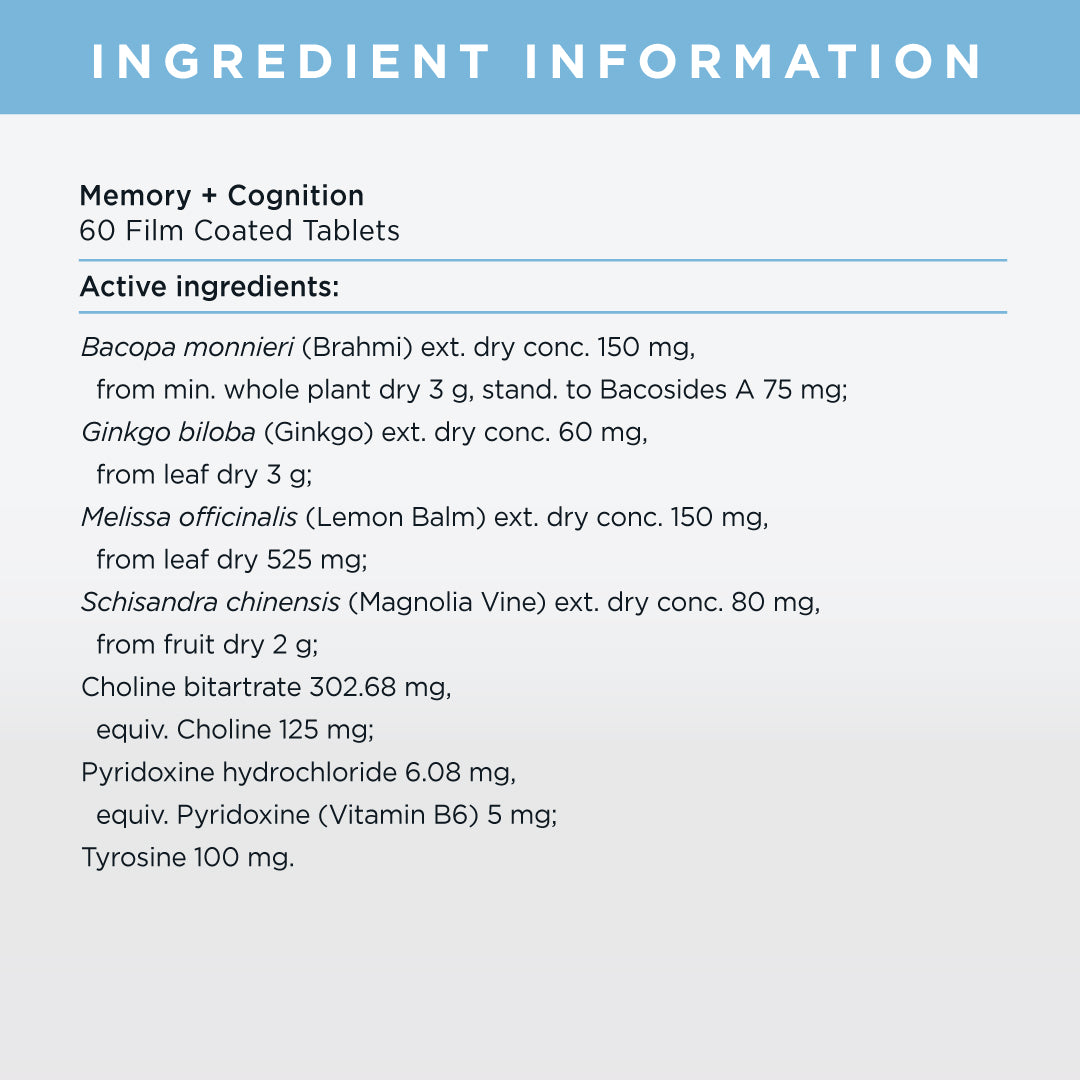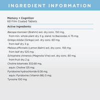 MEMORY + COGNITION: This formula contains Brahmi, which supports brain and mental function. Brahmi also maintains learning and information processing, and mental recall in elderly individuals. Lemon Balm decreases symptoms of mild anxiety, and calms nerves and the mind. Vitamin B6 supports energy levels, energy production, and general health and wellbeing. Vitamin B6 also supports immune system health and nervous system health, and relieves fatigue when dietary intake is inadequate.