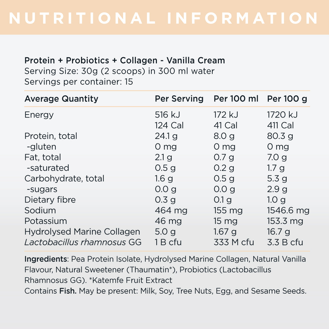 Pea Protein Isolate, Hydrolysed Marine Collagen, Natural Vanilla Flavour, Natural Sweetener (Thaumatin*), Probiotics (Lactobacillus Rhamnosus GG).