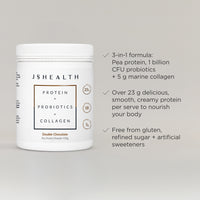 Our Protein + Probiotics + Collagen formula delivers a complete 3-in-1 approach: over 23 g of premium protein to support strength and recovery, 1 billion CFU of Lactobacillus rhamnosus GG probiotics to nurture gut health, and 5 g of premium marine collagen peptides for skin elasticity and hydration. Smooth, gut-friendly and versatile, it’s a daily ritual designed to fuel body, gut and skin in one delicious serve.