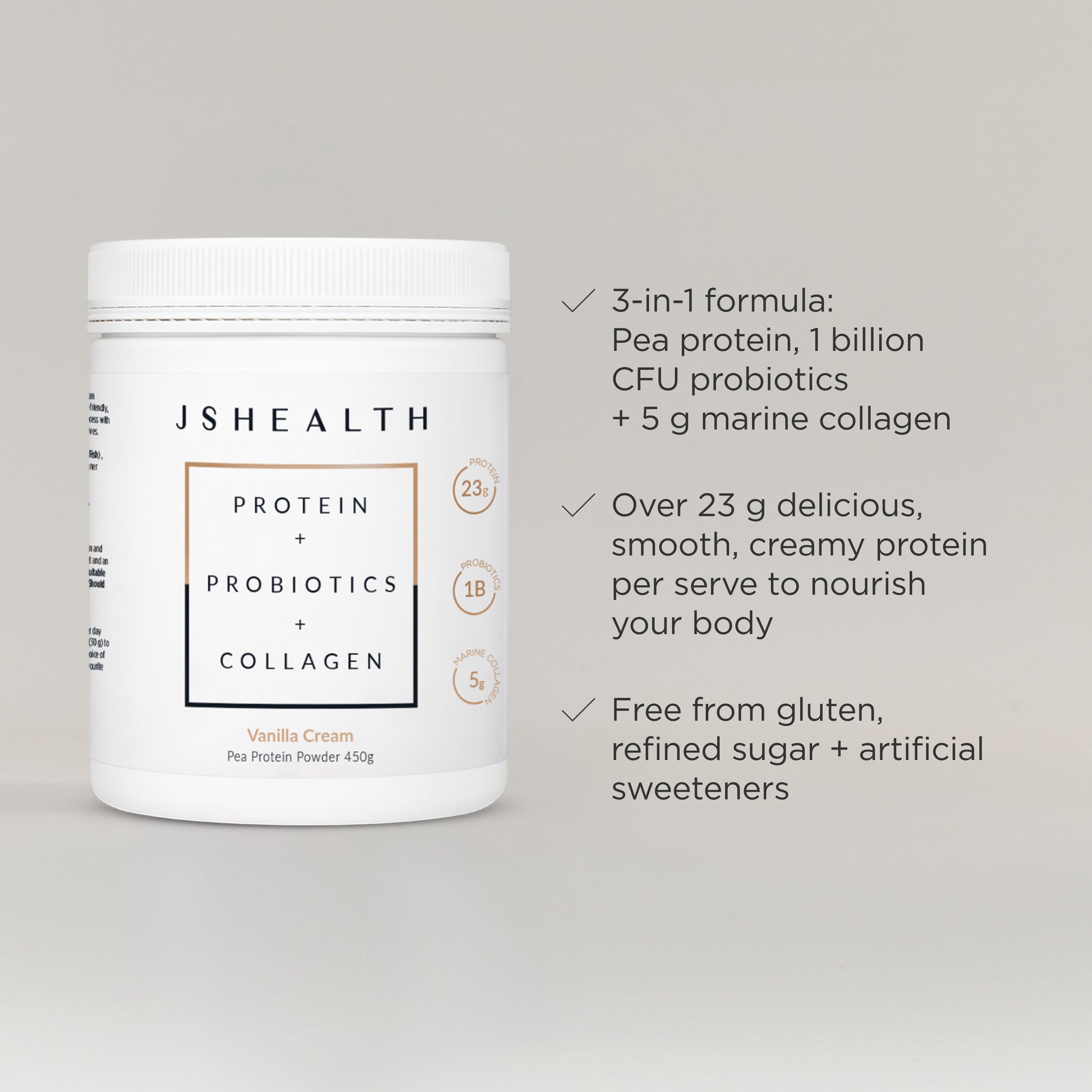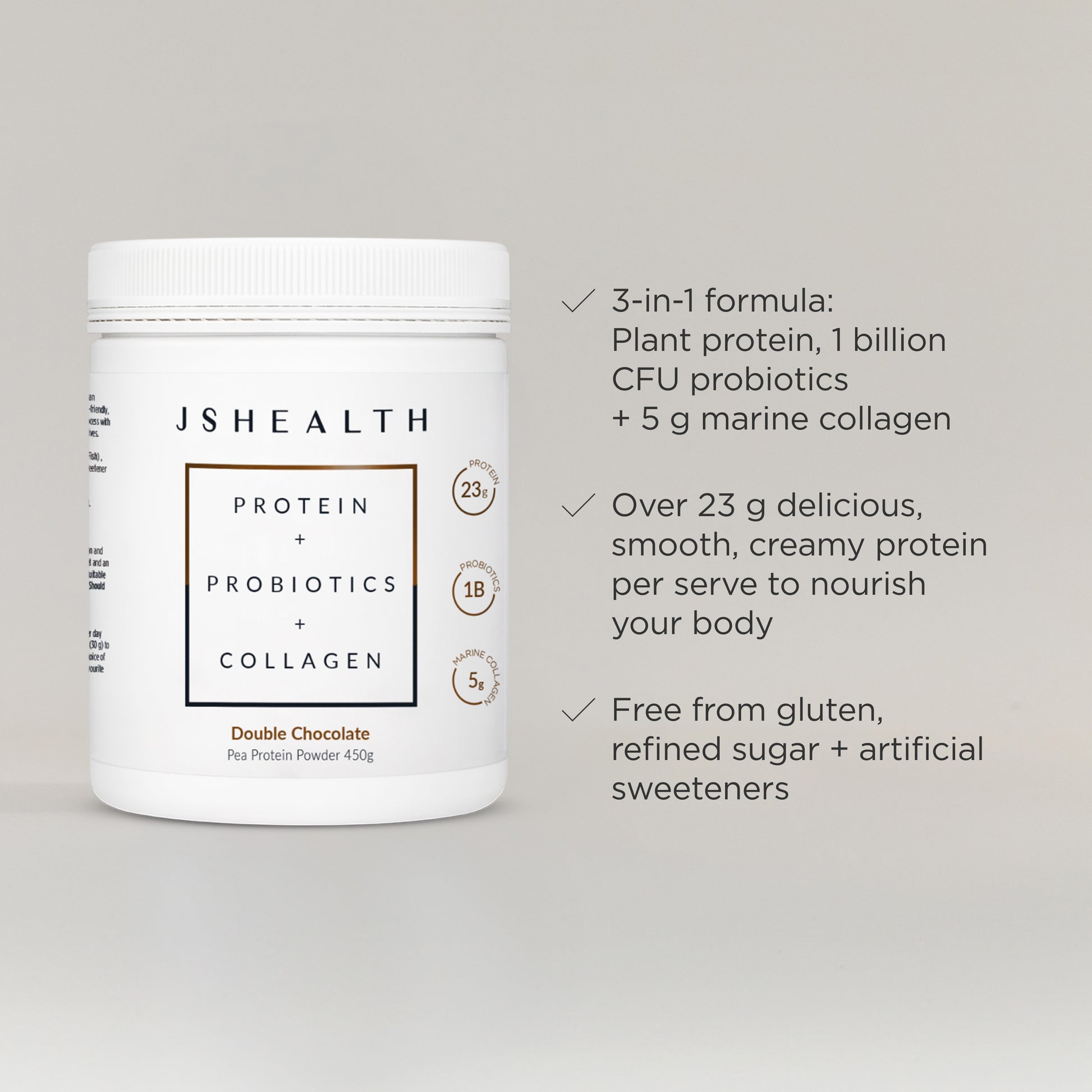 This innovative formula delivers over 23 g of plant-powered protein per serve, 1 billion CFU of probiotics and 5 g of hydrolysed Marine Collagen for functional wellness in its most delicious form.