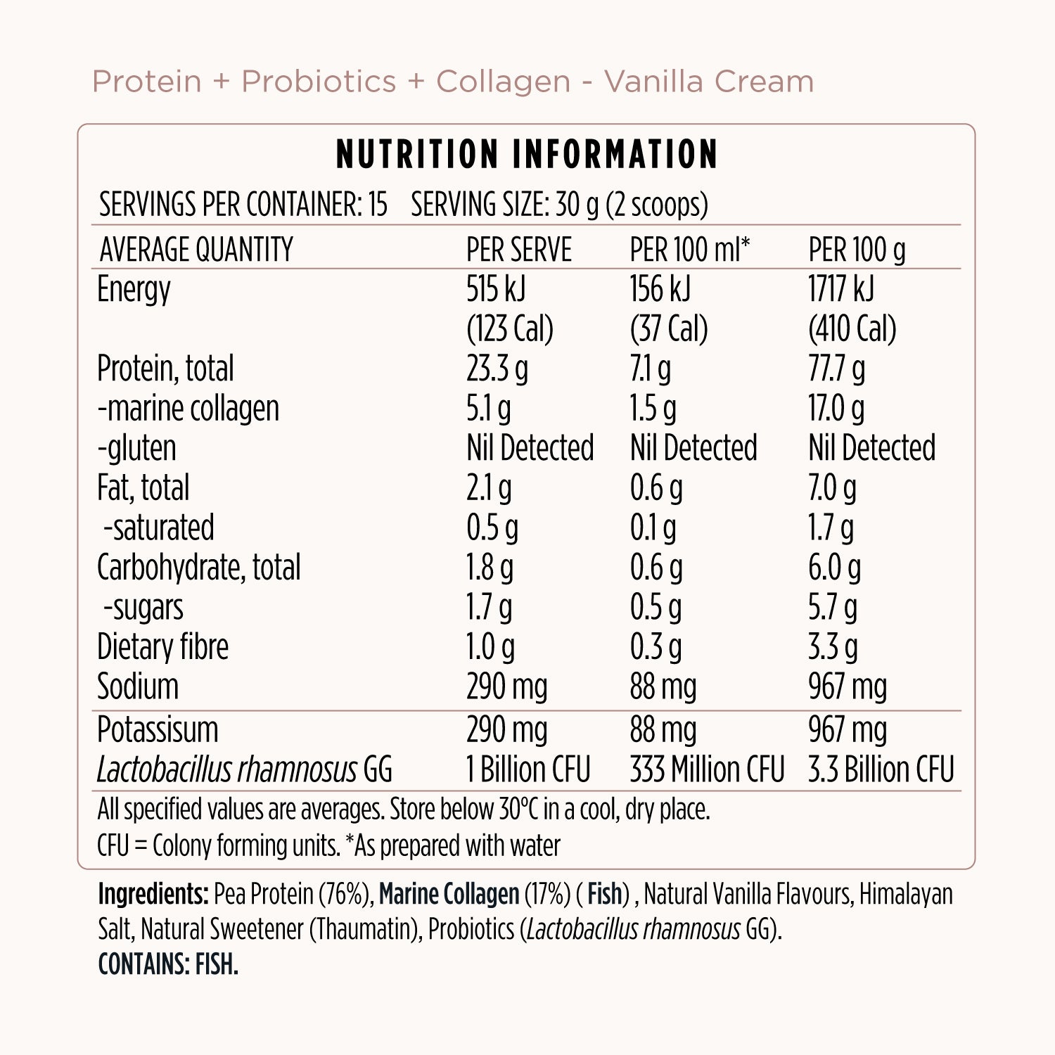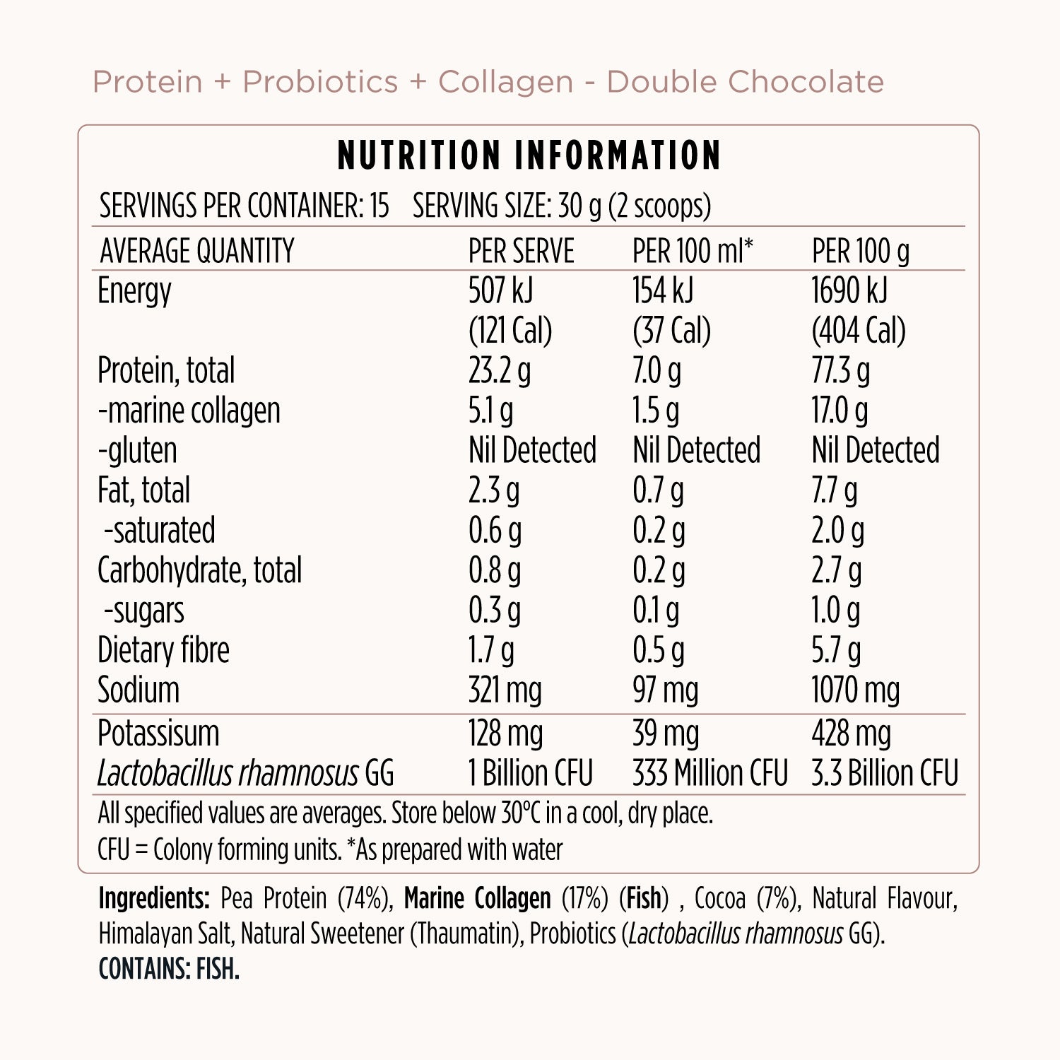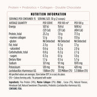 Pea Protein (74%), Marine Collagen (17%) (Fish) , Cocoa (7%), Natural Flavour, Himalayan Salt, Natural Sweetener (Thaumatin), Probiotics (Lactobacillus rhamnosus GG).