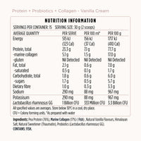 Pea Protein (76%), Marine Collagen (17%) ( Fish) , Natural Vanilla Flavours, Himalayan Salt, Natural Sweetener (Thaumatin), Probiotics (Lactobacillus rhamnosus GG).