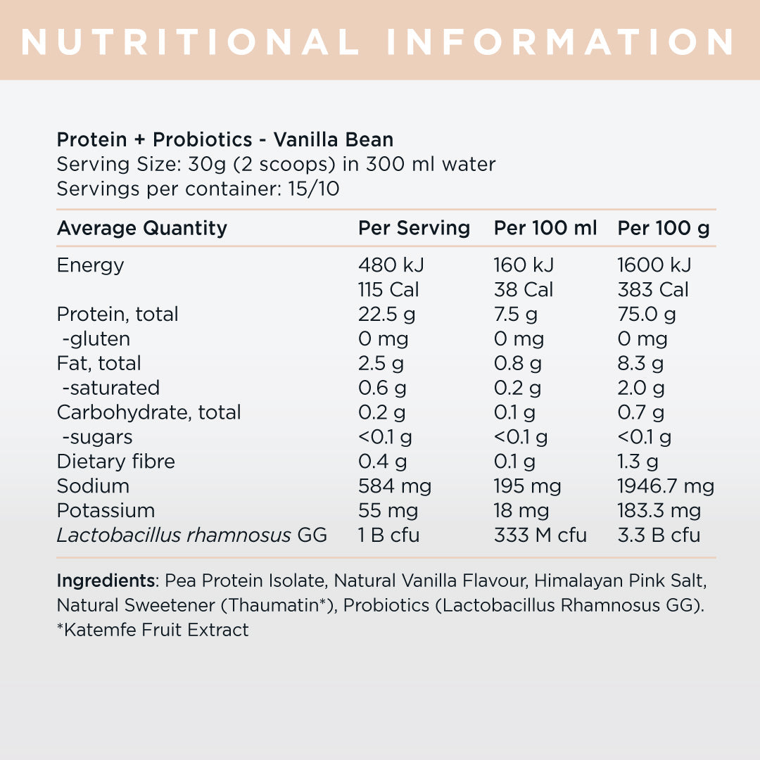 Pea Protein isolate, Natural Vanilla Flavour, Himalayan Pink Salt, Natural Sweetener (Thaumatin*), Probiotics (Lactobacillus Rhamnosus GG).