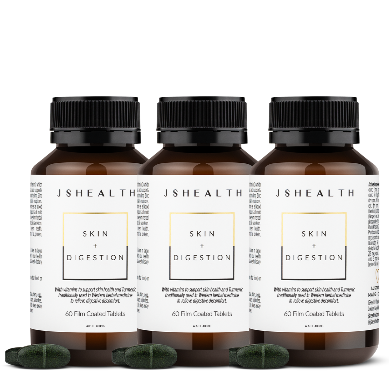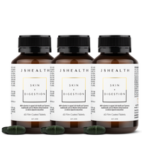The JSHealth Skin + Digestion formula contains Vitamin B2, Vitamin C, Zinc, Burdock and Turmeric.
