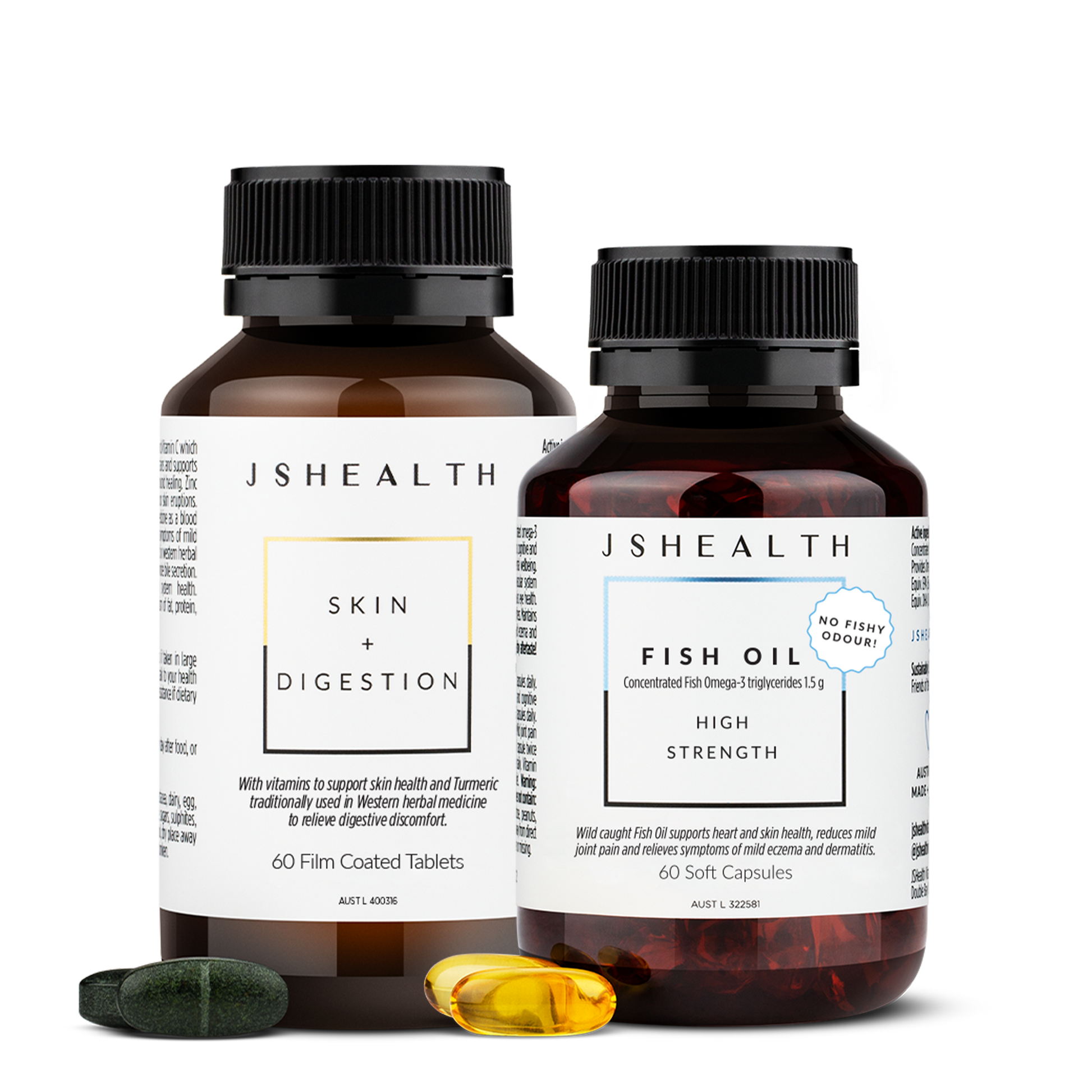 Support your skin's wellbeing with this pair for a radiant, confident you. The Complexion Confidence Perfect Pairing contains the Fish Oil+ (60s) and Skin + Digestion formulas.