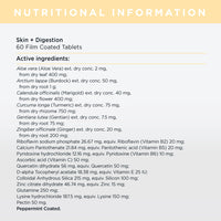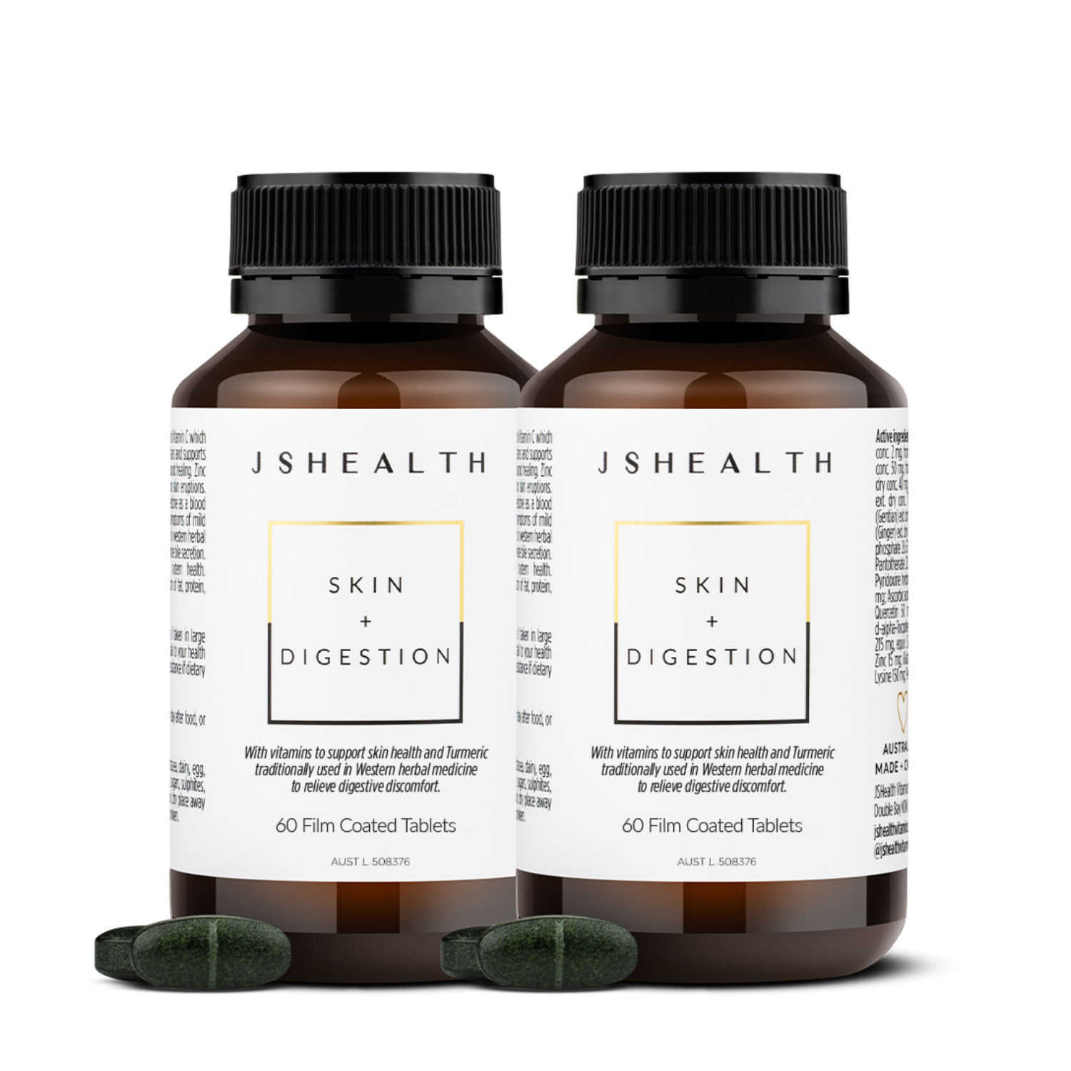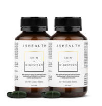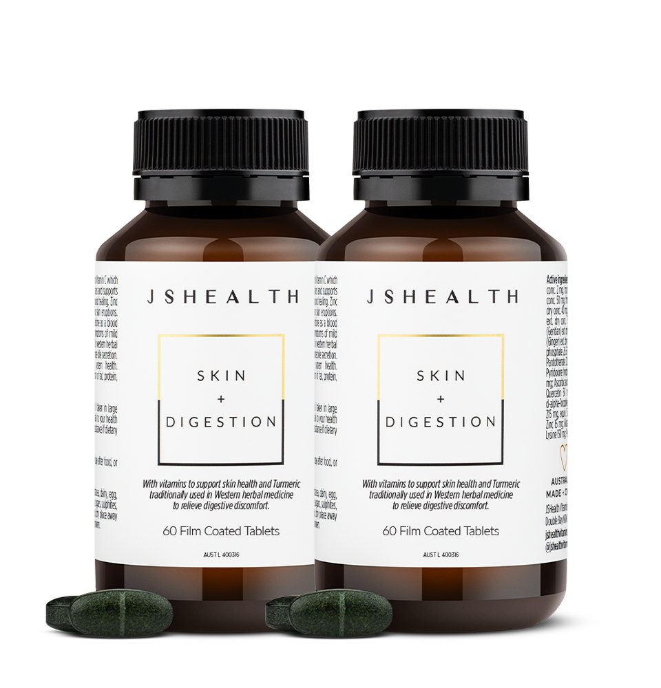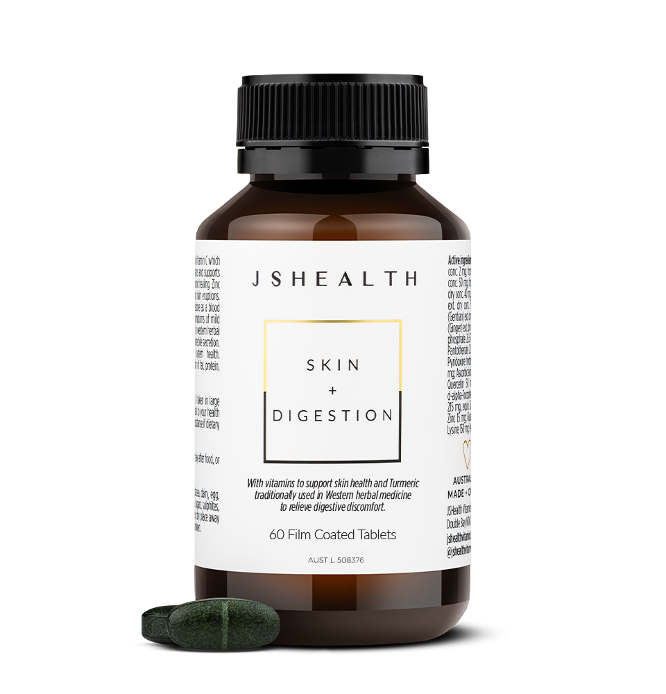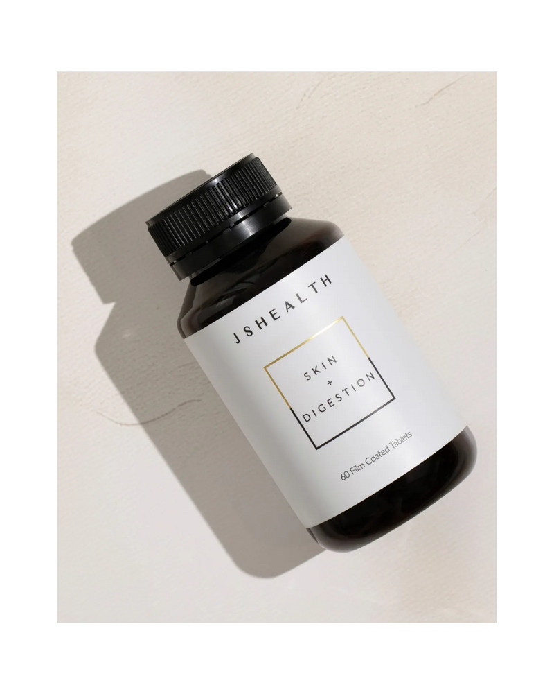 The JSHealth Skin + Digestion formula contains Vitamin B2, Vitamin C, Zinc, Burdock and Turmeric.