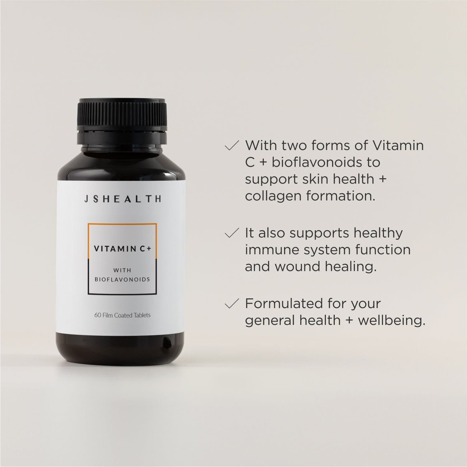 The JSHealth Vitamin C+ formula contains Vitamin C, Bioflavonoids and Quercetin.